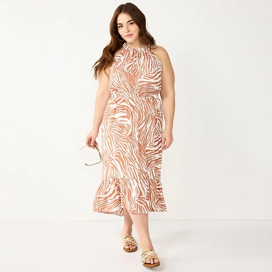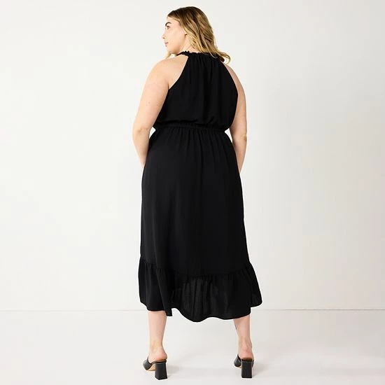 Keep your warm weather look classic and breezy in this women’s plus size halter neck hi-low midi dress from Nine West.