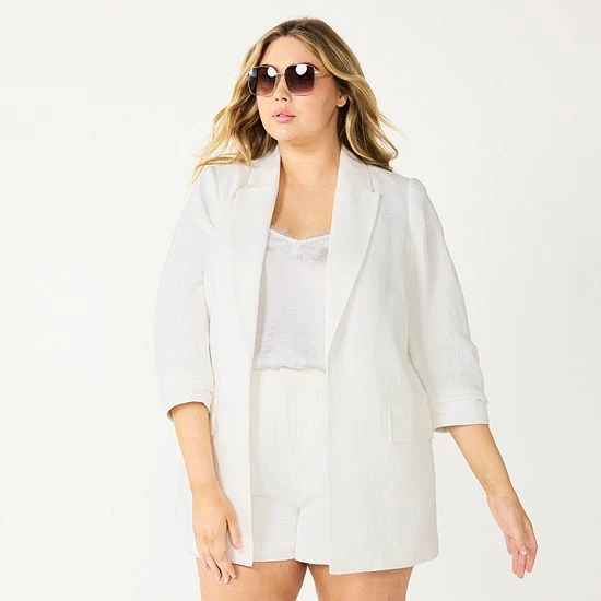 Keep your look chic in this women’s plus size ruched sleeve open-front blazer from Nine West.