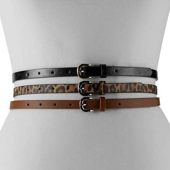 This Women’s Nine West 3 For 1 Belt Set offers a metallic, smooth, and leopard belt option.