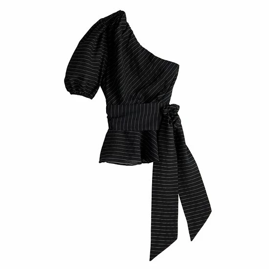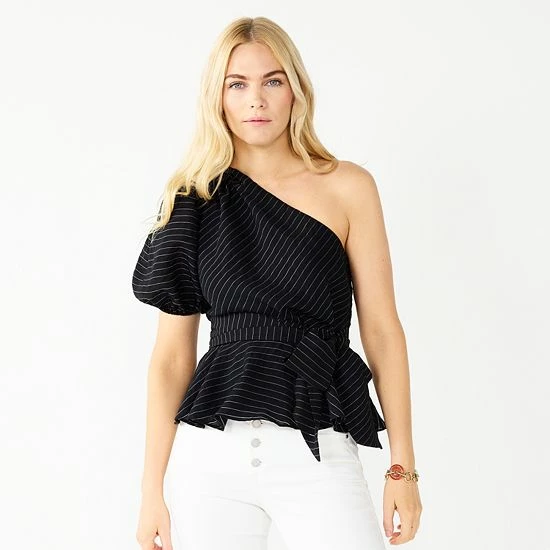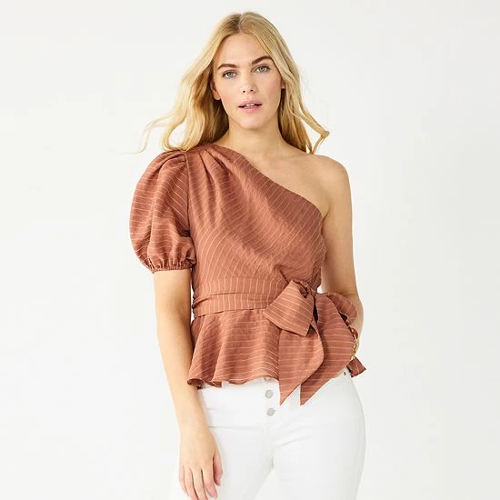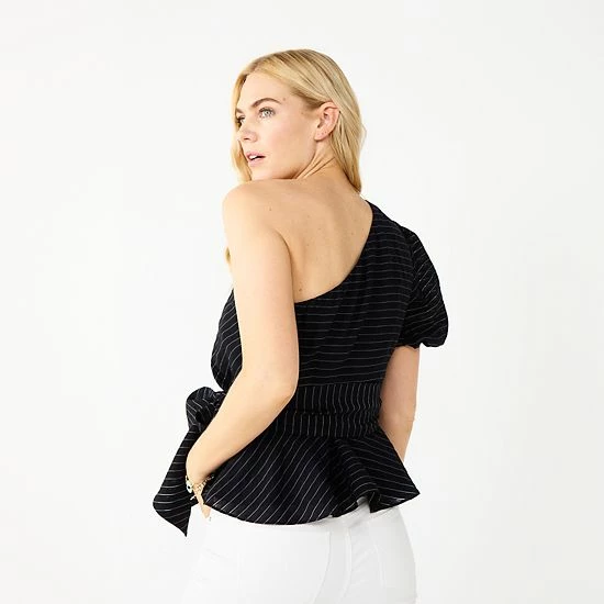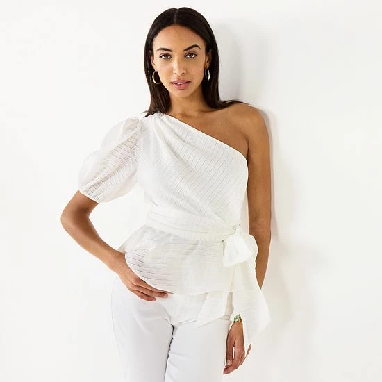 Refresh your warm weather wardrobe with this sweet bow-accented women’s one-shoulder peplum blouse from Nine West.